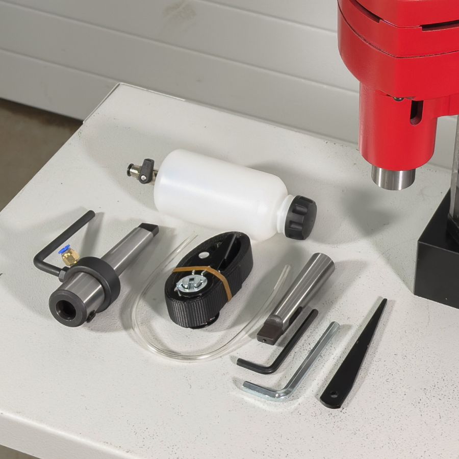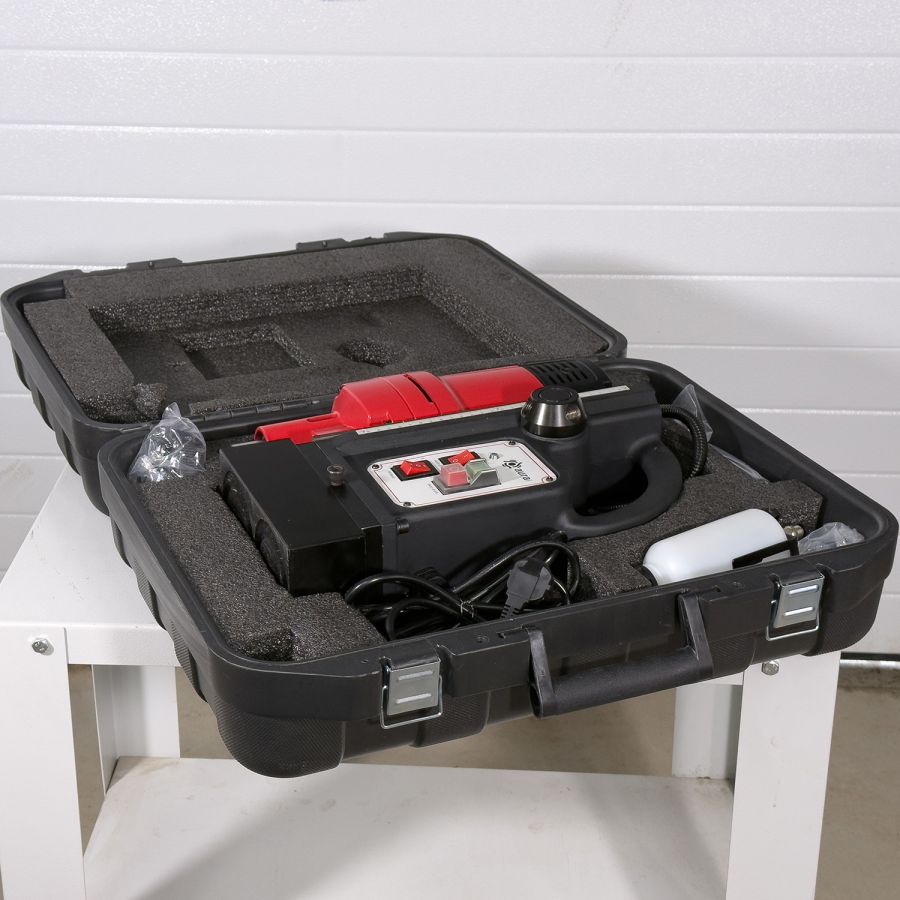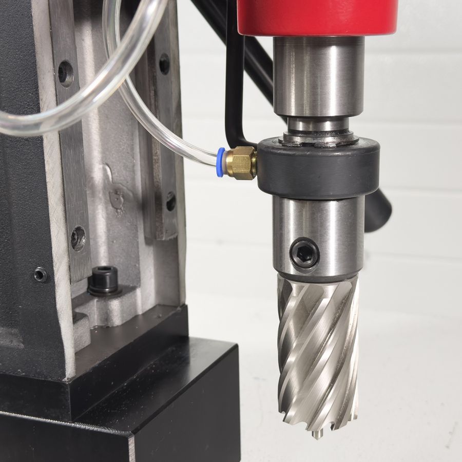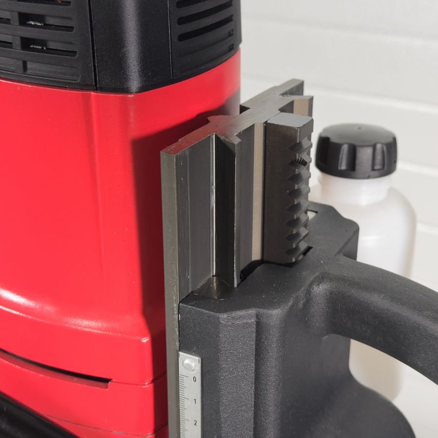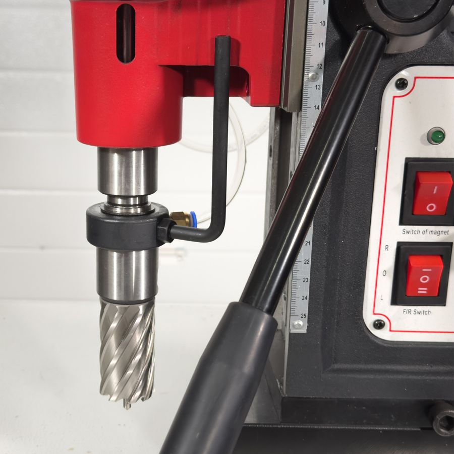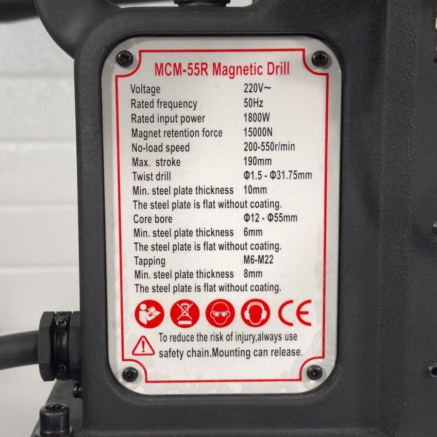 Переносной магнитный сверлильный станок AURA MCM-55R предназначен для промышленного использования, сверления отверстий до 55 мм корончатым сверлом и до 31 мм спиральным сверлом в различных сталях. Станок оснащен реверсом и позволяет нарезать резьбы до М22. Мобильность, надёжный электродвигатель мощностью 1800 Вт и массивное поворотное магнитное основание, имеющее силу притяжения 15000 H, обеспечивают уверенность в выполнении самых сложных задач. Машина имеет функцию плавной регулировки оборотов в диапазоне от 200 до 550 об/мин., что позволяет точнее выбрать режим обработки, а использование имеющейся системы подачи СОЖ в зону резания, исключит перегрев режущего инструмента и продлит срок его службы. Для более точного позиционировании на закрепляемой поверхности, предусмотрена возможность смещения станины относительно закрепленного магнитного основания в диапазоне 20 мм. Безопасность работы с станком обеспечивает прочный страховочный ремень, входящий с комплект поставки. Ремнем станок фиксируется к балке или конструкции на которой он установлен, что препятствует падению машины при аварийном отключении электроэнергии.