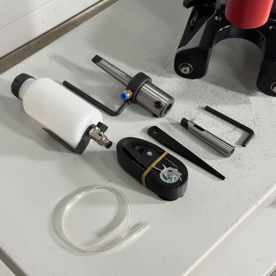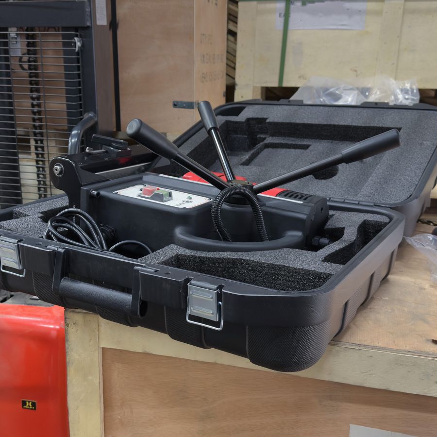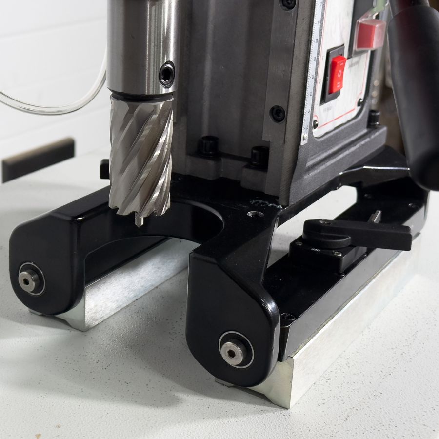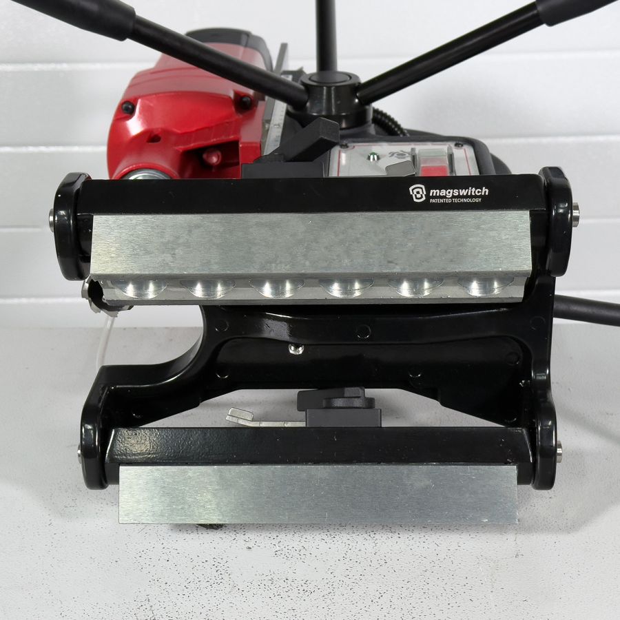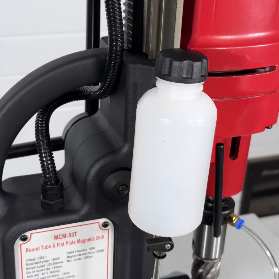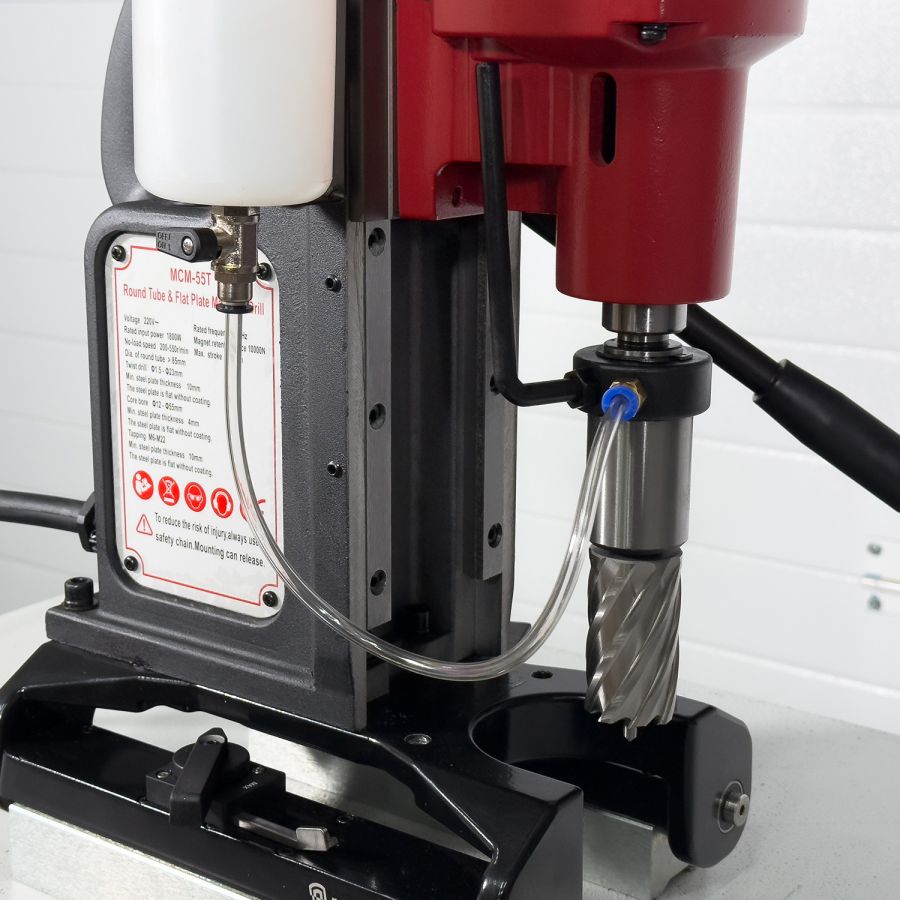 Переносной магнитный сверлильный станок для труб AURA MCM-55T предназначен для промышленного использования, сверления отверстий до 55 мм корончатым сверлом и до 23 мм спиральным сверлом в различных сталях как на ровных поверхностях, так и на выпуклых или вогнутых. Станок оснащен реверсом и позволяет нарезать резьбы до М22. Мобильность, надёжный электродвигатель мощностью 1800 Вт и два независимых постоянных магнита в основании, имеющие силу притяжения 10000 H, обеспечивают уверенность в выполнении самых сложных задач. Минимальный диаметр трубы, на которой можно закрепить станок с помощью магнитов составляет 85 мм. Машина имеет функцию плавной регулировки оборотов в диапазоне от 200 до 550 об/мин., что позволяет точнее выбрать режим обработки, а использование имеющейся системы подачи СОЖ в зону резания, исключит перегрев режущего инструмента и продлит срок его службы. Безопасность работы с станком обеспечивает прочный страховочный ремень, входящий с комплект поставки. Ремнем станок фиксируется к трубе или конструкции на которой он установлен, что препятствует падению машины при возникновении внештатной ситуации.