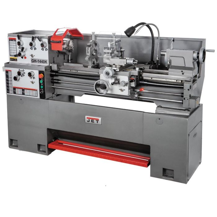 Многофункциональный токарно-винторезный станок JET GH-1440K на чугунном основании рассчитан на эксплуатацию промышленными предприятиями и крупными мастерскими, - там, где требуется особое качество и скорость обработки. Мощный асинхронный двигатель на 2,25 кВт способен обеспечивать работоспособность станка на протяжении всего рабочего дня. Станок полностью соответствует по ГОСТ 18097 классу точности «Н» - биение шпинделя не превышает 0,010 мм. На станке можно обтачивать детали диаметром до 360 мм над станиной, до 520 мм со снятым мостиком gap (длинна мостика 237 мм) и до 210 мм над суппортом.