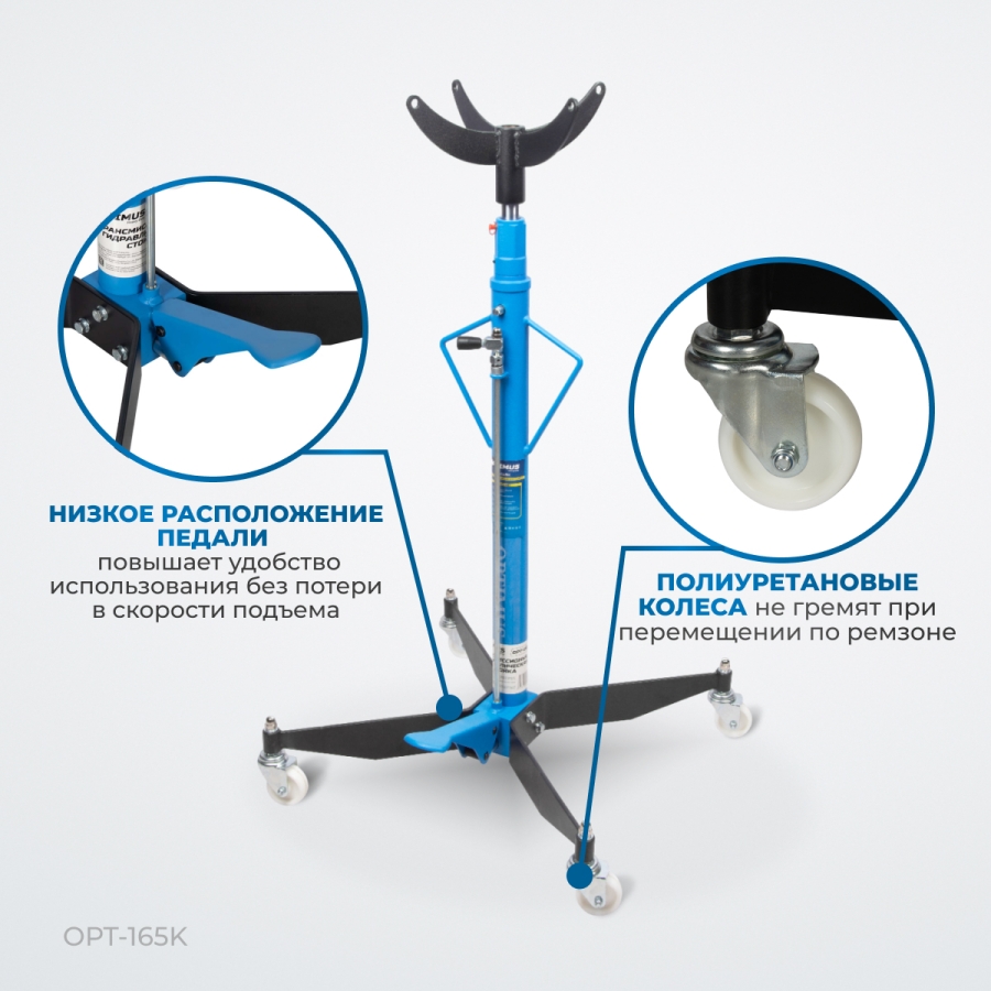 Гидравлическая трансмиссионная стойка OPTIMUS OPT-165K грузоподъемностью 500 кг. Используется в автосервисах, СТО и мастерских для ремонта трансмиссий, коробок передач и прочих систем автомобиля. Обладает высокой мобильностью благодаря ручкам и поворотным колёсам. Управление осуществляется с помощью ножной педали (подъем) и рукоятки выключения (опускание). Скорость опускания контролируется с помощью рукоятки. Ножная педаль повышает удобство и скорость работы, освобождает руки мастера. Благодаря встроенному клапану перегрузки повышается безопасность работ, проводимых на высоте от 1075 мм до 1890 мм. Рабочая платформа мобильна, её можно заменить на стол для трансмиссионной стойки по мере необходимости.