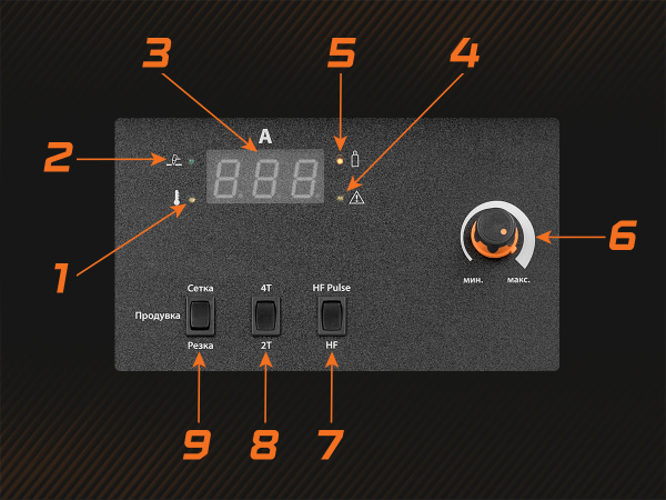 - Тумблер переключения типов поджига дежурной дуги. У аппарата 2 типа поджига дежурной дуги: HF Pulse — высокочастотный импульсный поджиг HF — высокочастотный поджиг