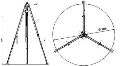 Тренога состоит из трех телескопических стоек, имеющих регулировку по высоте. Для этого стойка задвигается (выдвигается) с шагом 50 мм и фиксируется в одном из трех положений болтом. Стойки соединены между собой кронштейном, на котором закреплена серьга, на которую навешивается таль. В нижней части стоек находится резиновый жгут, служащий для фиксации треноги в сложенном состоянии.