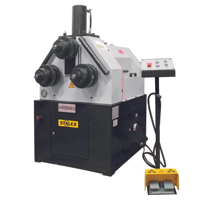 Станок профилегибочный гидравлический Stalex HRBM65мощный гидравлический трубогиб для гибки профильных труб, полосы, прутка. Усиленная конструкция для длительного срока службы, с 2-мя приводными роликами + гидравлический привод верхнего вала. Изменена конструкция в 2022г. с трёх приводных роликов на два приводных нижних ролика – для улучшенного проката большого диаметра труб. При прокате большого диаметра трубы, если все три ролика работают вместе, при вращении его по кругу скорость внутреннего и внешнего кругов различна, это приведет к повреждению поверхности при прокатке круглой трубы. Простое управление, удобен в работе. Для интенсивного промышленного применения. Максимальный размер труб - 70х70х3мм, 80х40х3мм