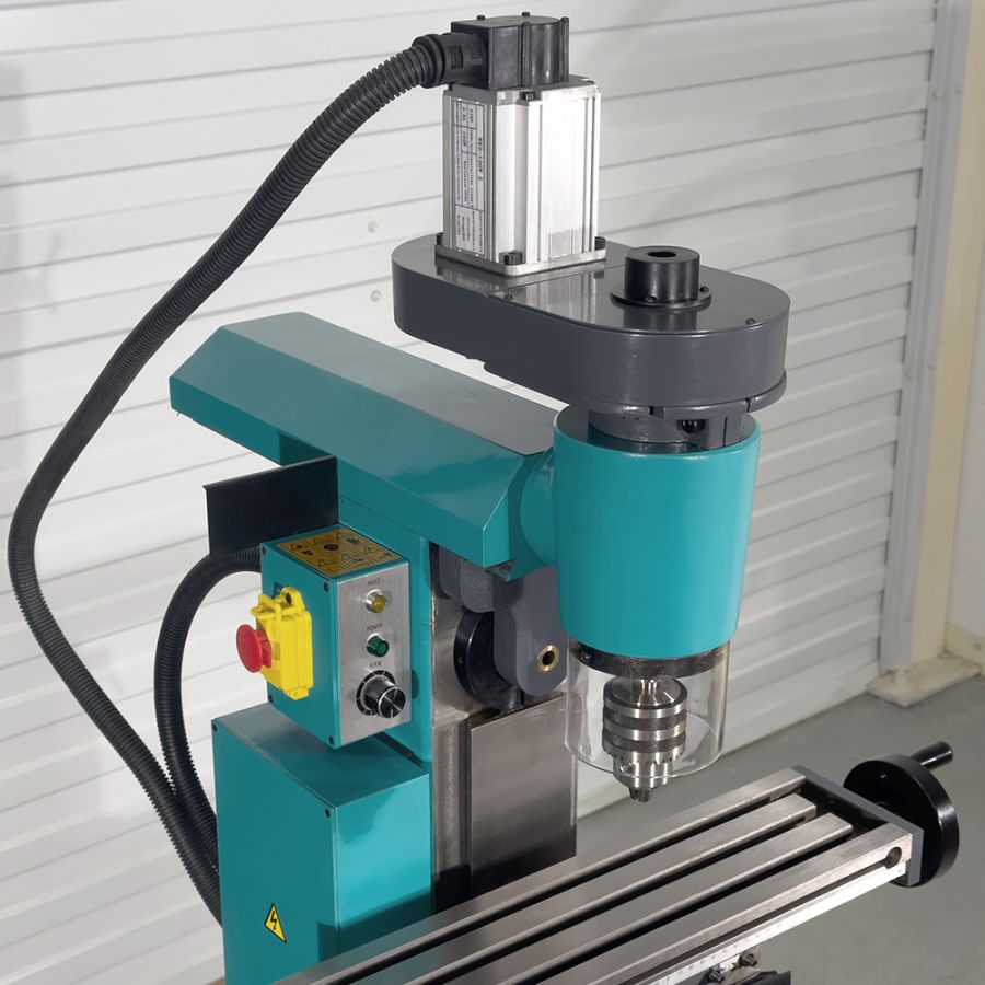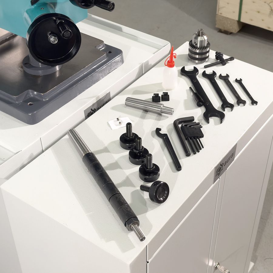 Станок AURA FM-30U оснащен горизонтальным шпинделем с посадочным диаметром для дисковых фрез 16 мм, а также фрезерной головой без хода пиноли с возможность её наклона влево и вправо в диапазоне +/- 45°. Максимальный диаметр используемых на данном станке дисковых фрез составляет 63 мм, а торцевых и концевых – до 30 мм. Входящий в комплект станка ключевой сверлильный патрон обеспечивает зажатие осевого инструмента с цилиндрическим хвостовиком диаметром от 1 до 13 мм. Максимальный диаметр сверления 16 мм.