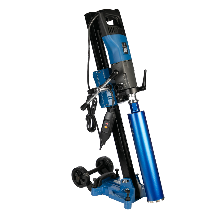 Установка алмазного бурения KEOS KS-180 Aset с функцией микроудара может эксплуатироваться как в ручную, так и с установкой на штатив. Штатив с возможностью регулировки угла наклона в диапазоне от 0 до 45 градусов. Применяется для сухого сверления отверстий в бетоне, асфальте и кирпиче диаметром до 160 мм. Мощность двигателя 1,9 кВт, работает от сети 220В. Максимальные обороты двигателя 1700 об/мин. Мотор оборудован быстросъемной муфтой для подключения пылесоса, а так же водяной муфтой для сверления с подачей воды. Комплект оснащен транспортировочными колесами, что позволяет без труда перемещать штатив с уже установленным мотором и коронкой по строительной площадке. Набор для проведения ТО входит в комплект поставки. Вес оборудования 21 кг.