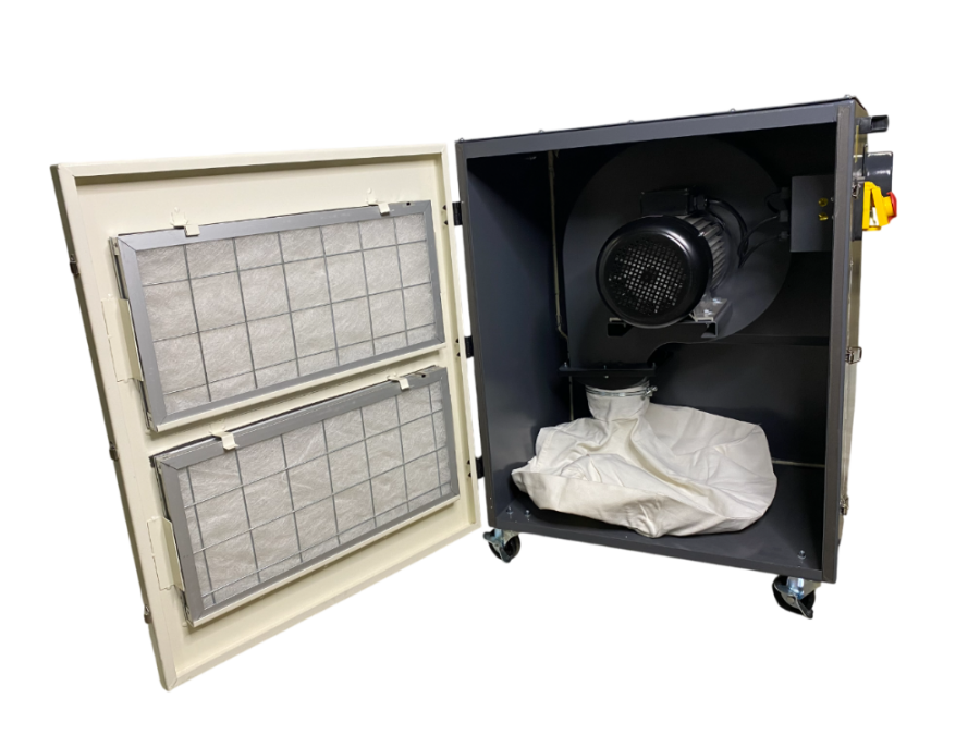 Основа установки это центробежный вентилятор, который создает разрежение воздуха, благодаря которому образуется поток, втягивающий все отходы реза (стружку, пыль) в разделительный узел. Крупные и тяжелые металлические частицы оседают в выдвижной ящик, а пыль и мелкие частицы, под воздействием потока воздуха, попадают в фильтр-мешок. В завершении более тонкую очистку осуществляют 2 фильтр-картриджа, установленные в дверце. Благодаря мобильному корпусу и эффективной системе очистки воздуха вытяжку для металлической стружки REALREZ MDC1500 400V можно установить в непосредственной близости от источника пыли.