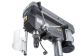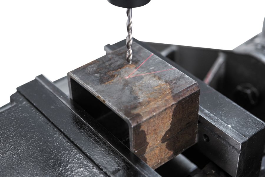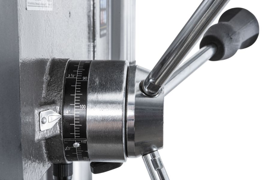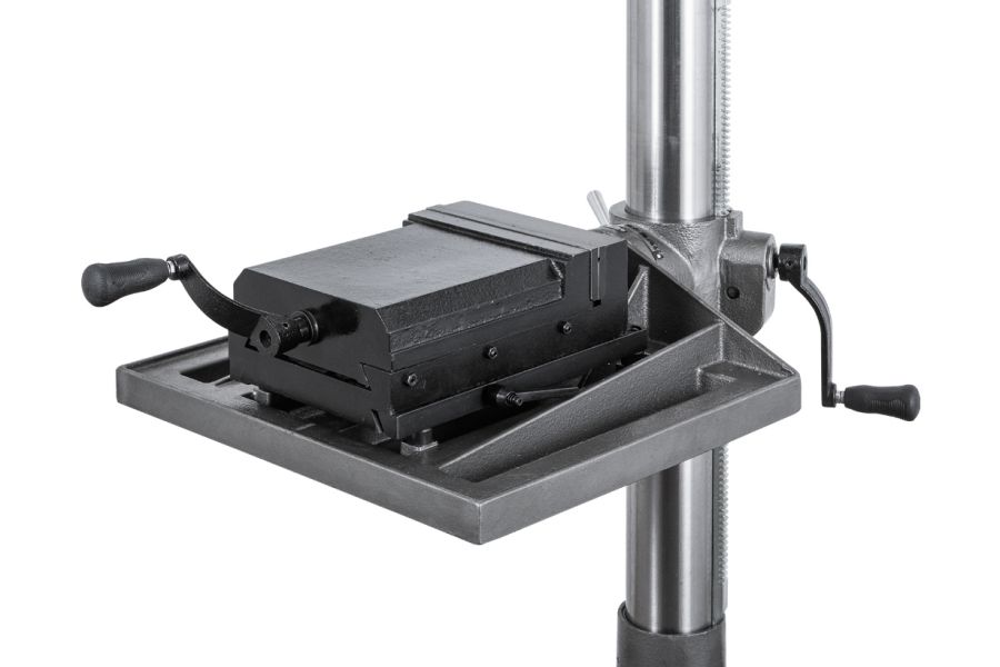 Стол имеет возможность поворота вокруг колонны на 360° и наклона вправо/влево по градуированной шкале на ±45°. Также может устанавливаться под углом в 90° для сверления в торце длинной заготовки. С другой стороны рабочего стола размещены встроенные тиски с шириной губок 210мм, расходом на 165мм и величиной перемещения вперед/назад на 165мм. Для упрощения размещения заготовки в тисках на станке встроен лазерный указатель, а для освещения рабочей зоны – светодиодная лампа местного освещения.