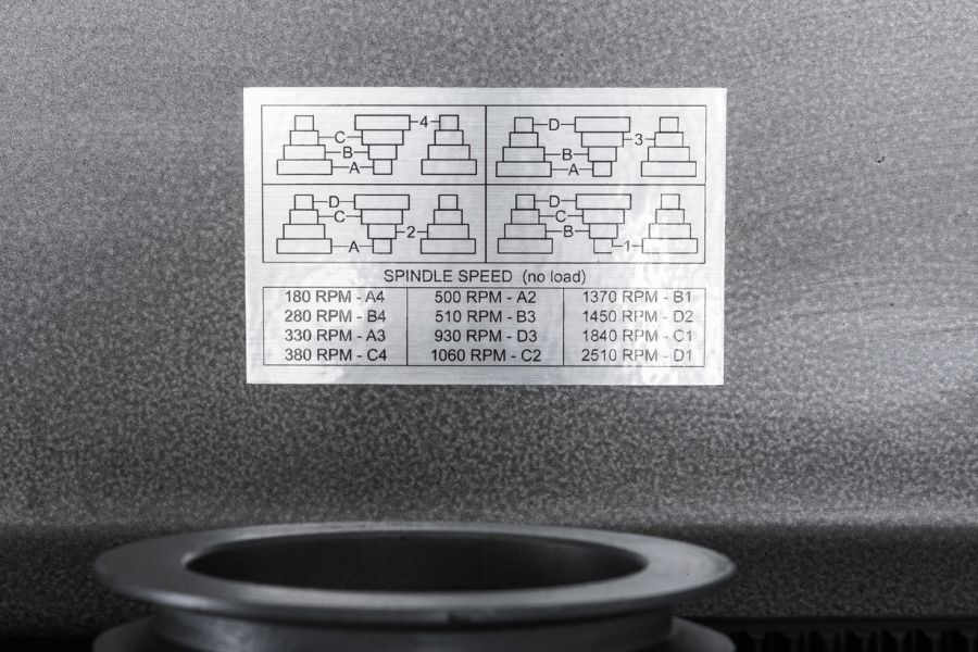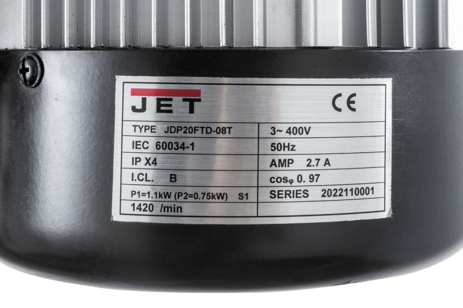 JDP 20FTD оснащен трехфазным асинхронным двигателем на 1.1 кВт, с питанием от промышленной сети в 400 В. Станок способен сверлить отверстия с максимальным диаметром до 25 мм. Вращающий момент с вала двигателя на шпиндель передается толстый клиновой ремень. На станке 12 скоростей в диапазоне от 180 до 2510 об/мин.