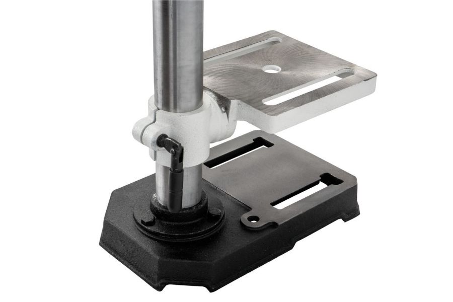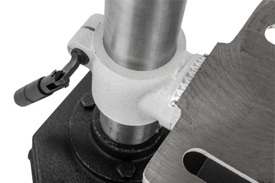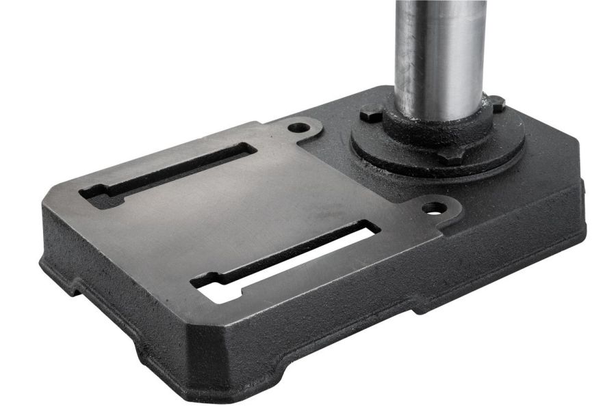 Пиноль шпинделя оборудована резьбовым упором-ограничителем, это простой в настройке и точный механизм, позволяющий производить установки с помощью штангенциркуля, или просто отсчитывая обороты гайки. Заготовку размещают на регулируемом чугунном столе. Он поворачивается вокруг горизонтальной оси, перемещается вверх и вниз по колонне, а если потребуется разместить крупную заготовку, может быть отведен в сторону разворотом на колонне. В таком случае опорой выступает верхняя поверхность подставки станка, отфрезерованная в плоскость, перпендикулярную оси сверления.