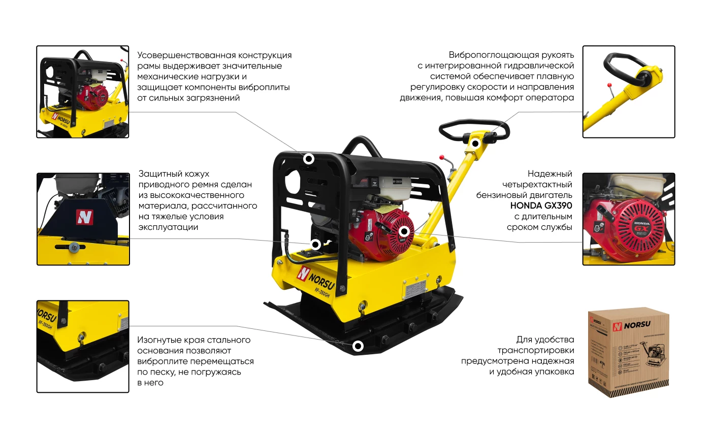 Виброплита NORSU RF-350GH представляет собой реверсивную модель — возможно возвратно-поступательное движение. Отличается высоким уплотняющим усилием, используется для уплотнения различных видов грунтов. Наличие гидравлического привода облегчает управление виброплитой, позволяя плавно менять направление движения, что способствует более качественному уплотнению материалов. Глубина уплотняемого слоя достигает 900 мм, топливный бак рассчитан на объем 6.1 л.