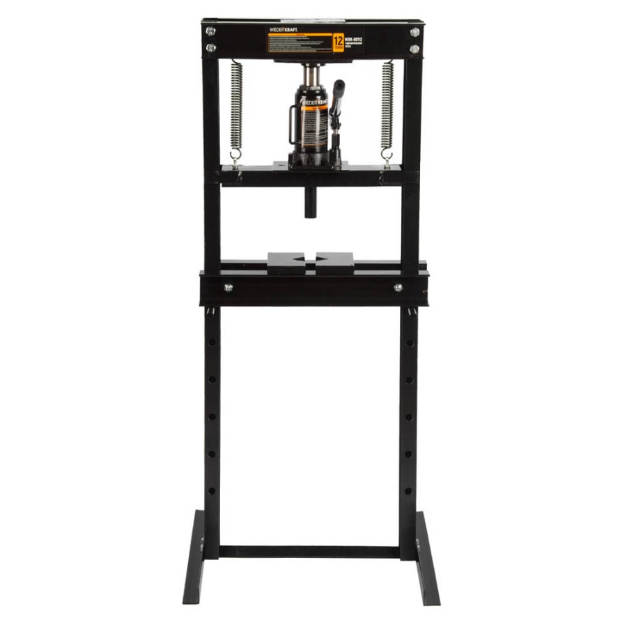 Напольный гидравлический пресс с бутылочным домкратом WiederKraft WDK-80112, который обеспечивает усилие в 12000 кг. Гидравлический напольный пресс применяется в автосервисах, СТО, ремонтных мастерских и на производственных предприятиях для установки и съема деталей автомобиля и других транспортных средств, а также для аккуратной правки, гибки и запрессовки заготовок. Силовым элементом конструкции является гидравлический бутылочный домкрат, который приводится в действие при помощи рукояти. Устойчивое положение модели обеспечивается благодаря поперечным пластинам основания. Отверстия стоек позволяют с легкостью менять высоту стола (рабочий диапазон составляет 0-920 мм).