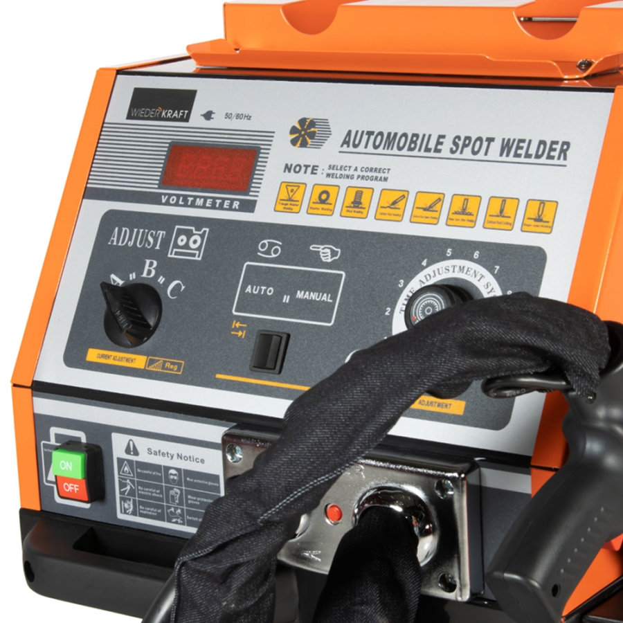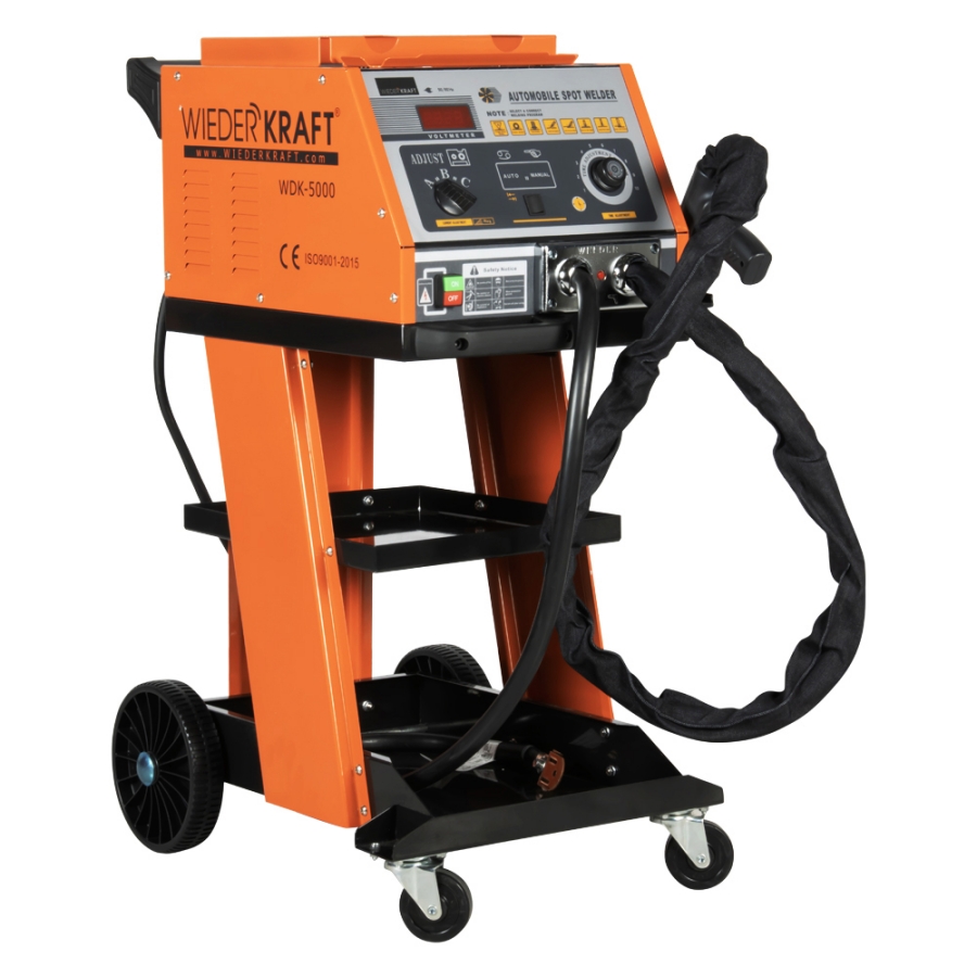 Профессиональный аппарат WiederKraft WDK-5000 для выравнивания и рихтовки металлических элементов автомобильного кузова (максимальный ток 3800 А). Панель управления оснащена переключателем силы сварочного тока позиционного типа (А-В-С) и регулятором времени импульса сварки для быстрой настройки параметров. Благодаря наличию аналогового регулятора времени есть возможность контролировать продолжительность проведения сварочных работ. Все органы управления аппаратом защищены износостойким пластиком. Цикличный режим работы сохраняет необходимый уровень заряда и не приводит к перегреву оборудования. Тележка споттера имеет боковую планку и полки для размещения принадлежностей и инструмента. Модель оснащена маневренными колесами и удобной ручкой, что гарантирует легкость перемещения устройства по рабочей площадке. Модель WDK-5000 не подходит для сварки листов.