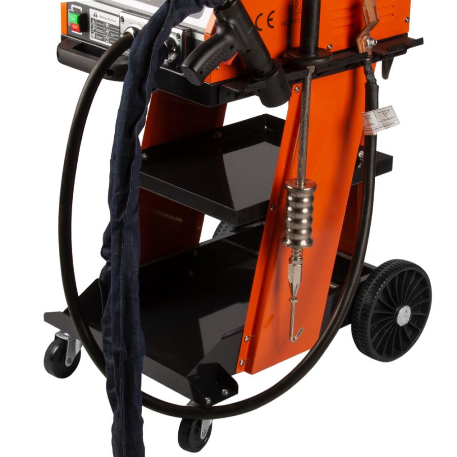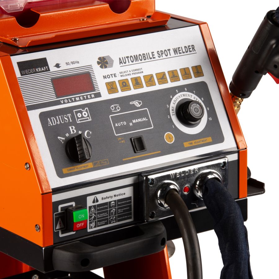 Профессиональный аппарат WiederKraft WDK-6000 для выравнивания и рихтовки металлических элементов автомобильного кузова (максимальный ток 4400 А). Панель управления оснащена переключателем силы сварочного тока позиционного типа (А-В-С) и регулятором времени импульса сварки для быстрой настройки параметров. Благодаря наличию аналогового регулятора времени есть возможность контролировать продолжительность проведения сварочных работ. Все органы управления аппаратом защищены износостойким пластиком. Цикличный режим работы сохраняет необходимый уровень заряда и не приводит к перегреву оборудования. Тележка споттера имеет боковую планку и полки для размещения принадлежностей и инструмента. Модель оснащена маневренными колесами и удобной ручкой, что гарантирует легкость перемещения устройства по рабочей площадке. Аппарата точечной сварки поставляется с широким набором сварочных аксессуаров и инструментов, а также с органайзером для хранения с расходных материалов. Модель WDK-6000 не подходит для сварки листов.
