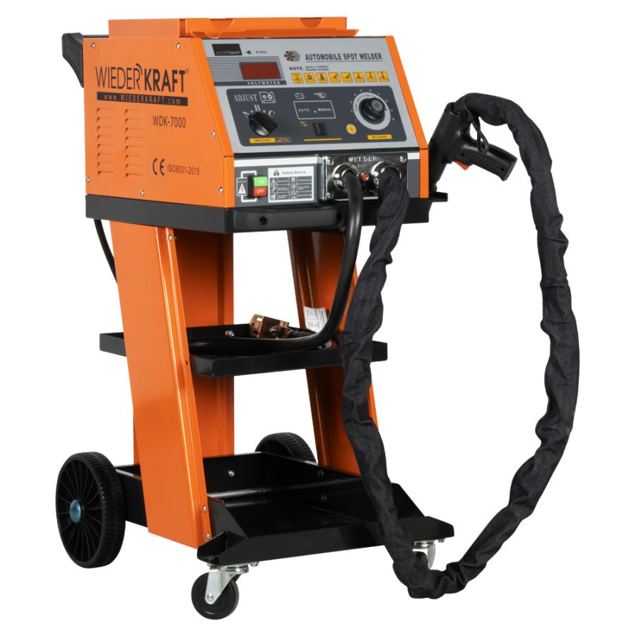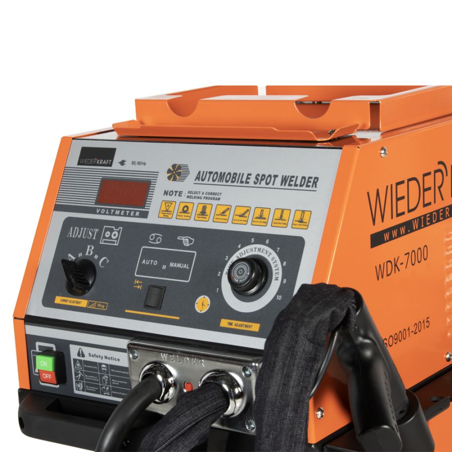 Профессиональный аппарат WiederKraft WDK-7000 для кузовных работ по выравниванию и рихтовке металлических поверхностей, а также односторонней точечной сварки (максимальный ток 4600/5200 А). Панель управления аппаратом оснащена переключателем силы сварочного тока позиционного типа (А-В-С) и регулятором времени импульса сварки для быстрой настройки параметров. Все органы управления защищены износостойким пластиком. Функциональное отличие данной модели от других устройств серии заключается в возможности подключать его к сети как 220 В, так и 380 В. Цикличный режим работы сохраняет необходимый уровень заряда и не приводит к перегреву оборудования. Тележка аппарата имеет боковую планку и полки для размещения принадлежностей и инструмента. Споттер оснащен маневренными колесами и удобной ручкой, что гарантирует легкость перемещения устройства по рабочей площадке. Аппарата точечной сварки WDK-7000 поставляется с широким набором сварочных аксессуаров и инструментов, а также с органайзером для хранения с расходных материалов.