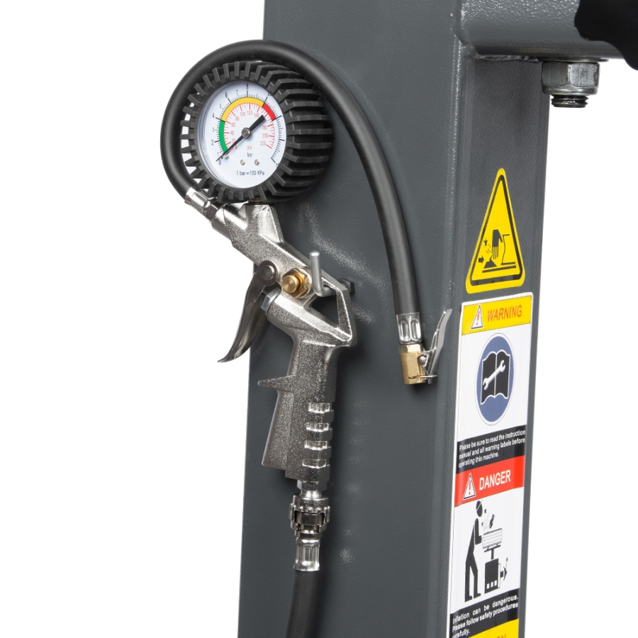 Благодаря пневматическому цилиндру двухстороннего действия, отжимная лопатка движется в обеих плоскостях без необходимости отводить её вручную, а широкая резиновая накладка обеспечит бережную работу с шинами;
