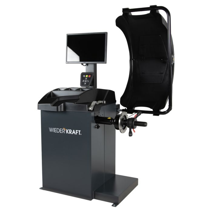 Балансировочный станок WiederKraft WDK-777B для обслуживания легкового и малого коммерческого транспорта с максимальным диаметром колёс до 1000 мм. Предназначен для измерения и устранения дисбаланса у колёс с дисками диаметром от 10 до 24 дюймов в шиномонтажных мастерских, автосервисных предприятиях и станциях технического обслуживания. Оснащен информативным LCD дисплеем с трехмерной визуализацией рабочего процесса. Наличие электронной линейки с измерением двух параметров (расстояние и диаметр диска), ультразвукового датчика для измерения ширины колес, а также возможность запуска цикла балансировки закрытием кожуха обеспечат скорость работы, что особенно важно в шиномонтажный сезон. Также, данный станок оснащен лазерным индикатором линии установки грузиков. Широкое опорное основание, специальная конструкция виброузла и вал с увеличенным диаметром 40 мм гарантируют надежность оборудования и высокую точность балансировки ±1 г. Защитный кожух, выполненный из высокопрочного пластика, защитит оператора от мелких камней и грязи при вращении колеса. WDK-777B работает от бытовой сети 220 вольт и может быть использован даже в небольших мастерских, где отсутствует трёхфазное подключение. Комплектация балансировочного стенда позволит сразу приступить к работе с большинством видов колёс и включает балансировочные клещи, конусы, кронциркуль, прижимную чашу, быстрозажимную гайку и эталонный грузик для самокалибровки.