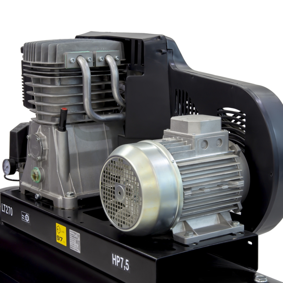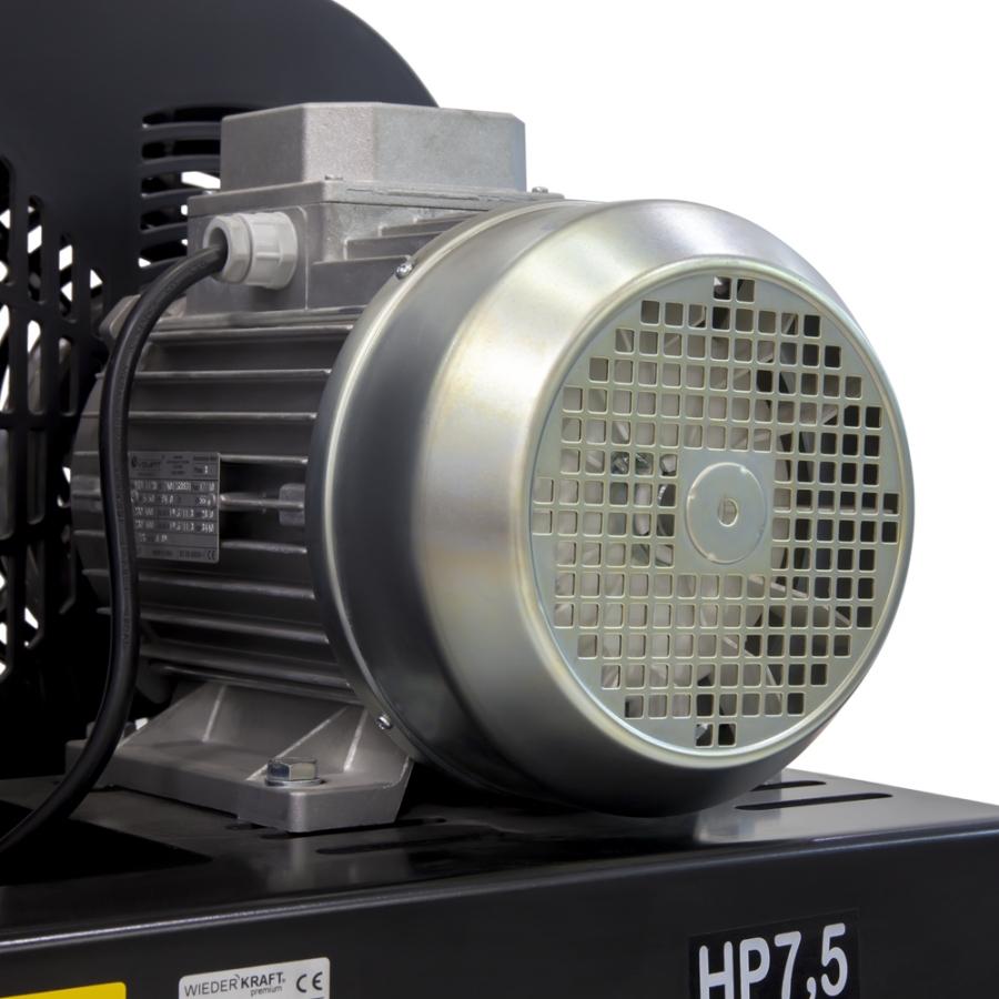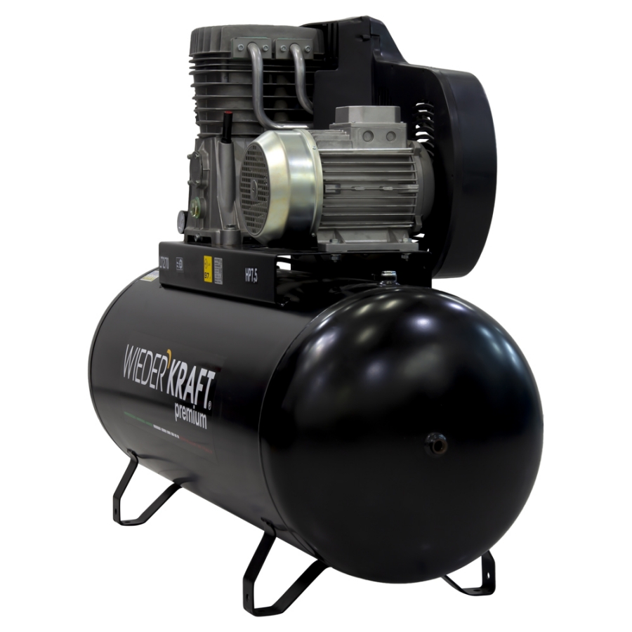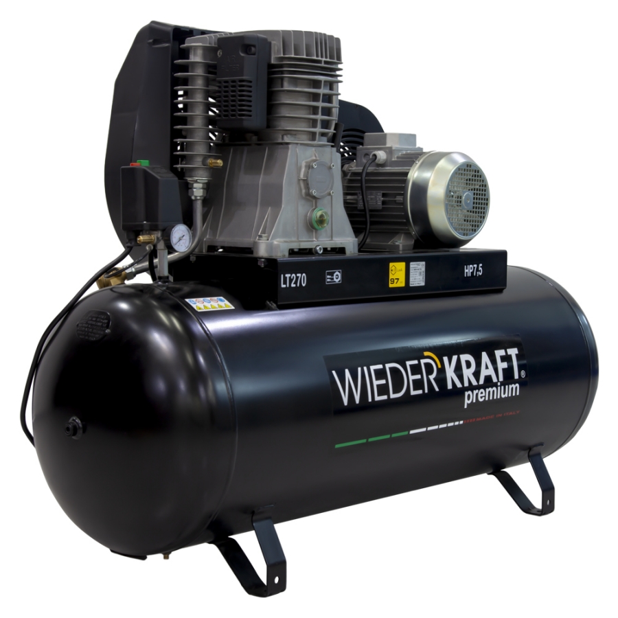 Стационарный поршневой компрессор с ременным приводом WiederKraft WDK-92779, который обеспечивает производительность 798 л/мин. Данная модель относится к классу профессионального оборудования и используется в случаях, когда требуется подача большого объема воздуха на длительное время. Компрессор предназначен для использования в дерево- и металлообрабатывающей промышленности, при выполнении покрасочных и дорожных работ, а также в сервисных центрах и шиномонтажных мастерских. Двухступенчатая система сжатия воздуха обеспечивает стабильную работу самого требовательного пневматического инструмента и оборудования. Множество охлаждающих ребер компрессорной головки обеспечивает эффективное охлаждение двигателя, защищая его от перегрева, что является гарантией бесперебойной работы. Антикоррозийное покрытие ресивера увеличивает срок службы агрегата. В днище ресивера есть специальный кран для быстрого слива конденсата. Устойчивость обеспечивается наличием парных металлических опор по обе стороны ресивера. У опор имеются специальные отверстия для установки колес в случае необходимости. Основными преимуществами данного агрегата являются ременной привод, эффективное охлаждение, ресивер на 270 литров и двигатель мощностью 5,5 кВт, обеспечивающий высокую производительность — 798 л/мин.